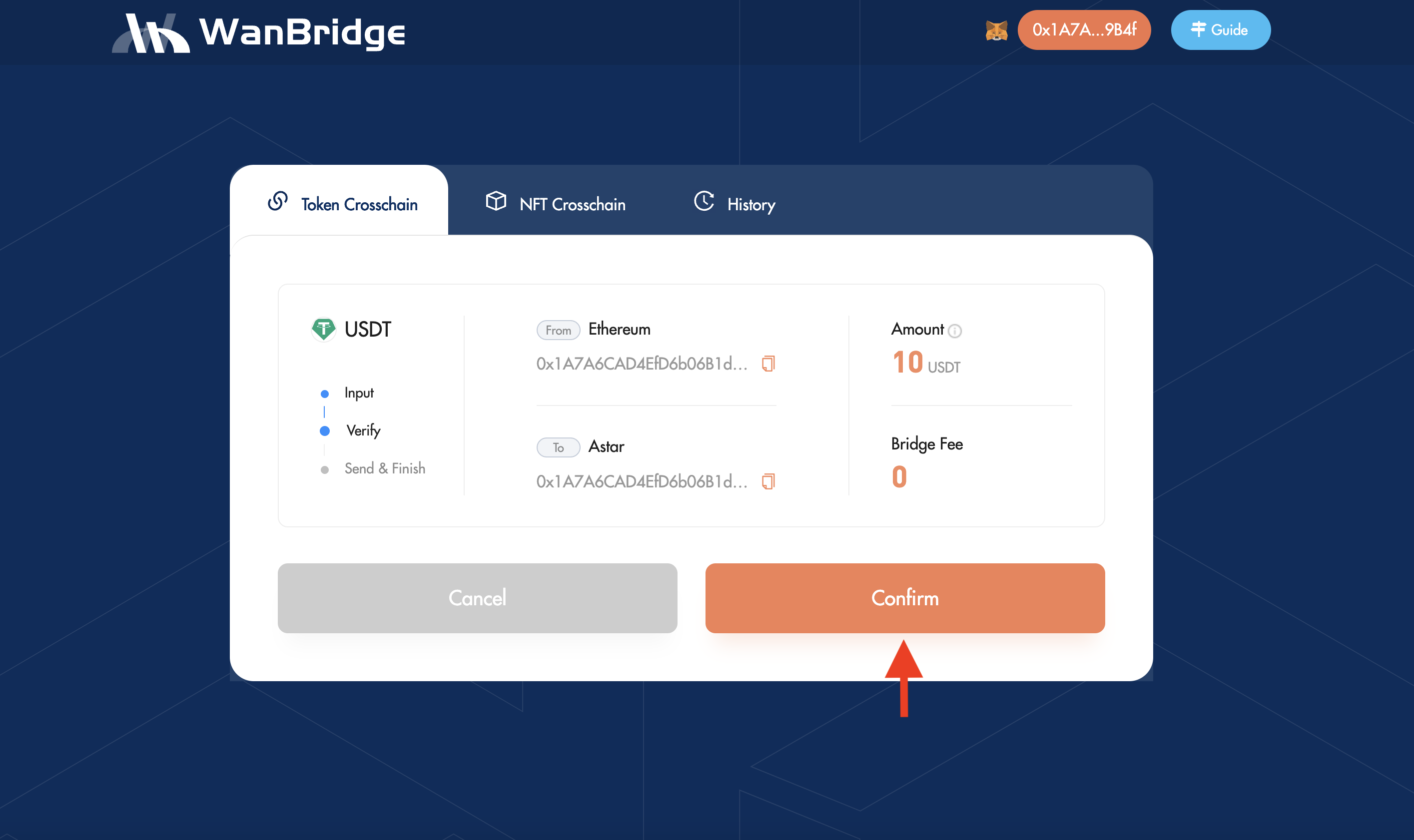 Visit the Wanchain Bridge web portal. Initiate a cross-chain transaction to move your $USDT from Ethereum to Astar.