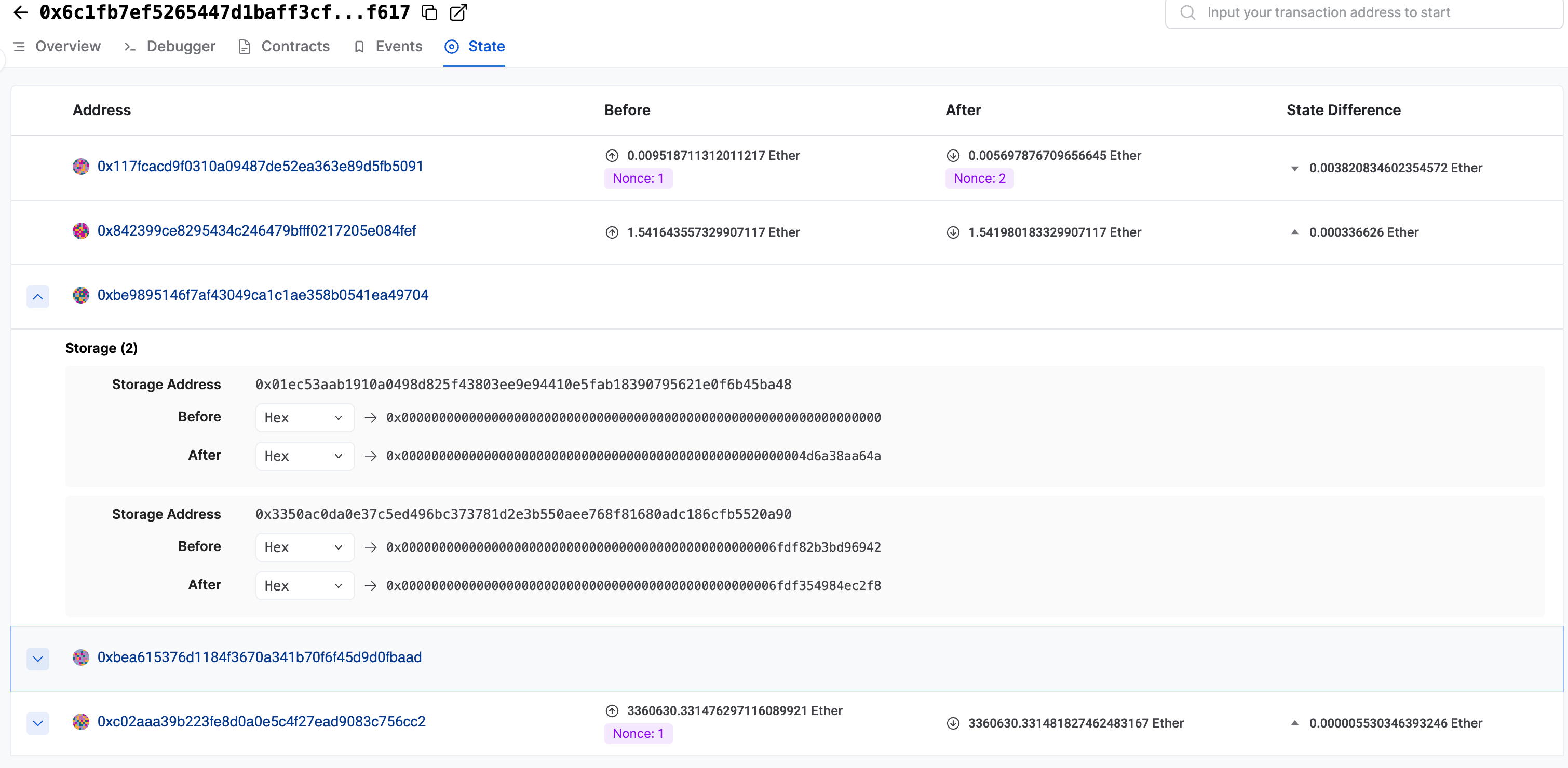 When a transaction causes state changes, Sentio lists them on the State tab.