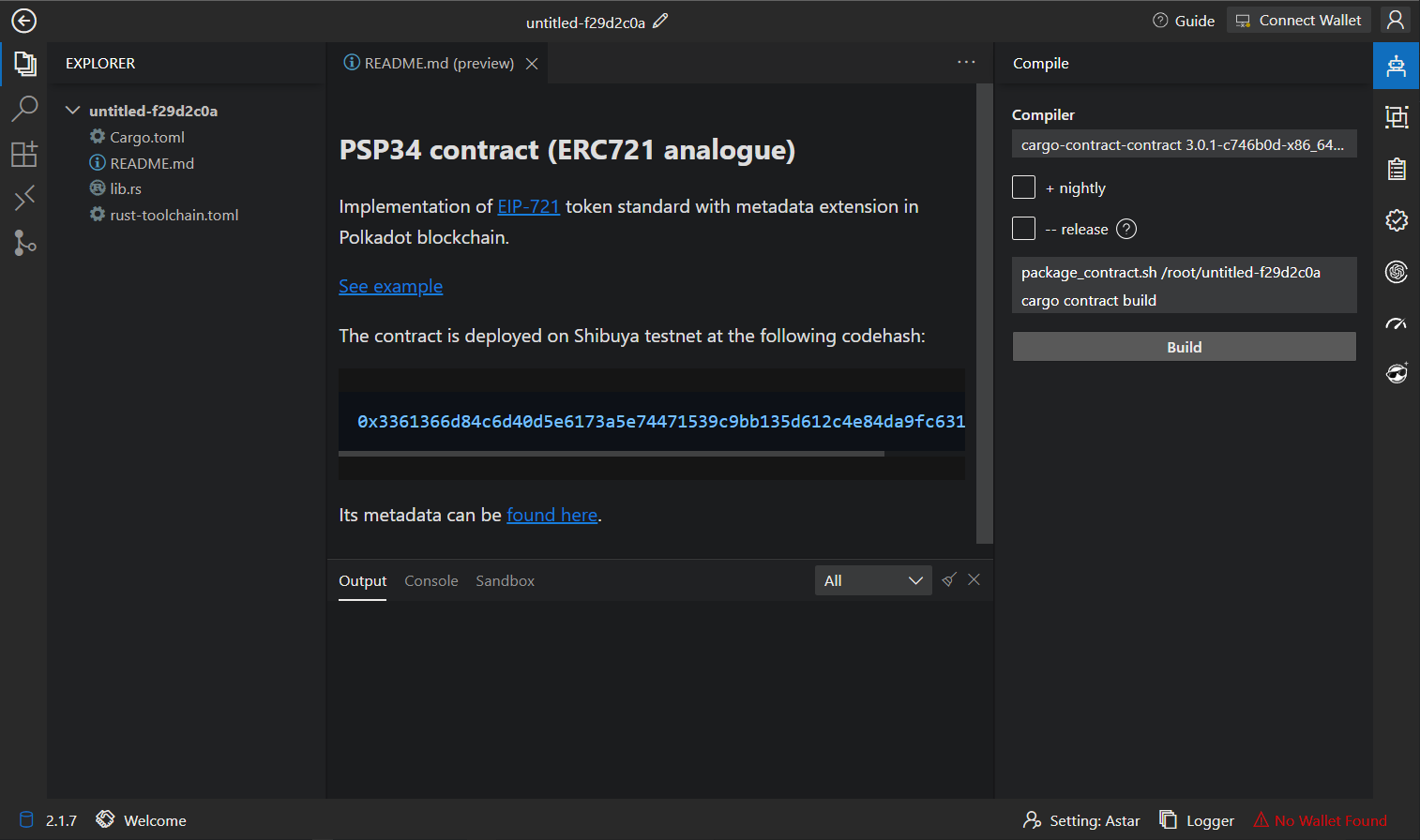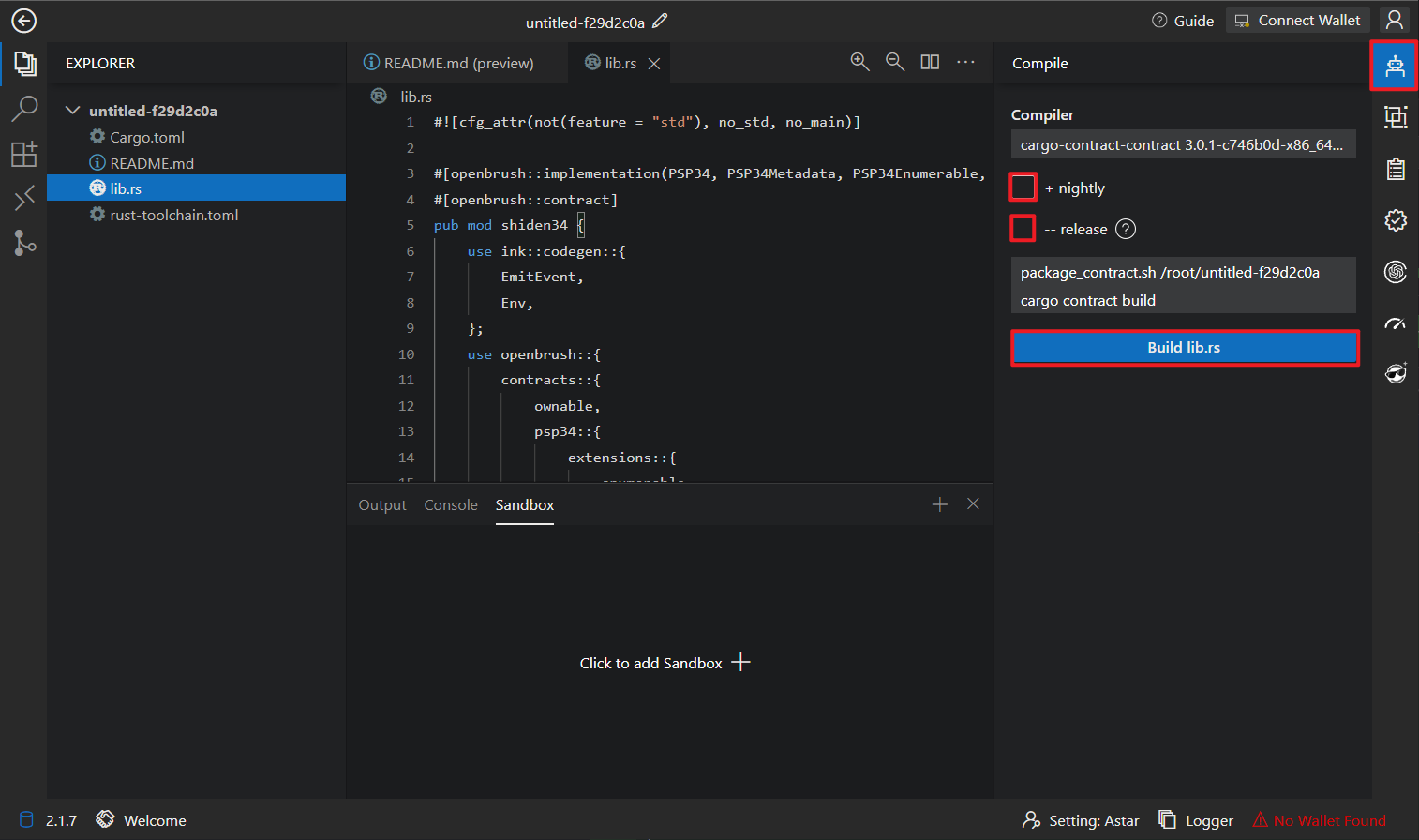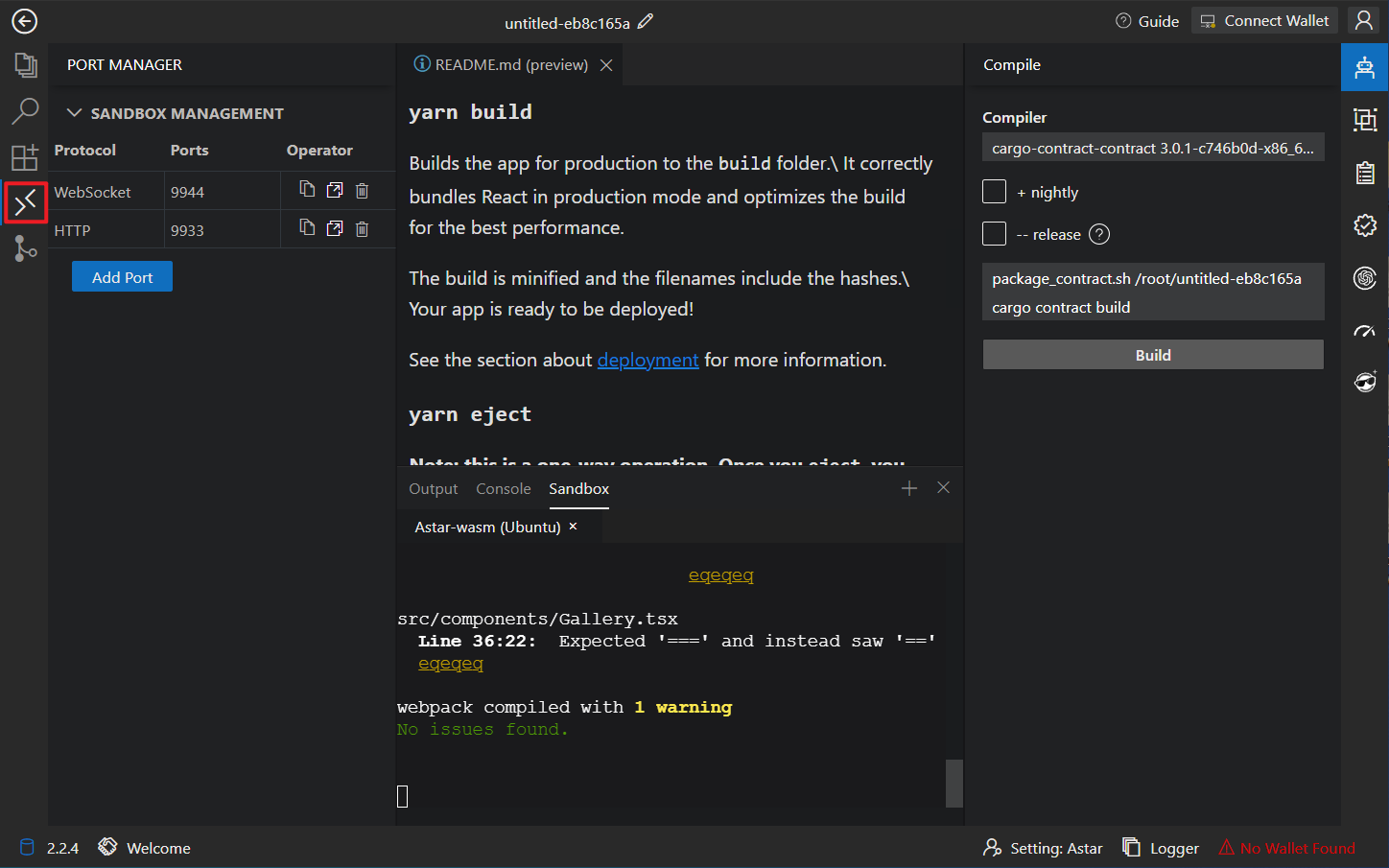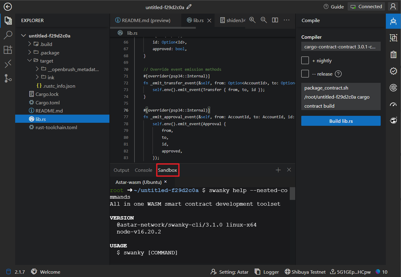 If you prefer command-line development, you can open the Astar WASM Sandbox, which comes pre-loaded with Swanky Suite, Git and Node.js V16.