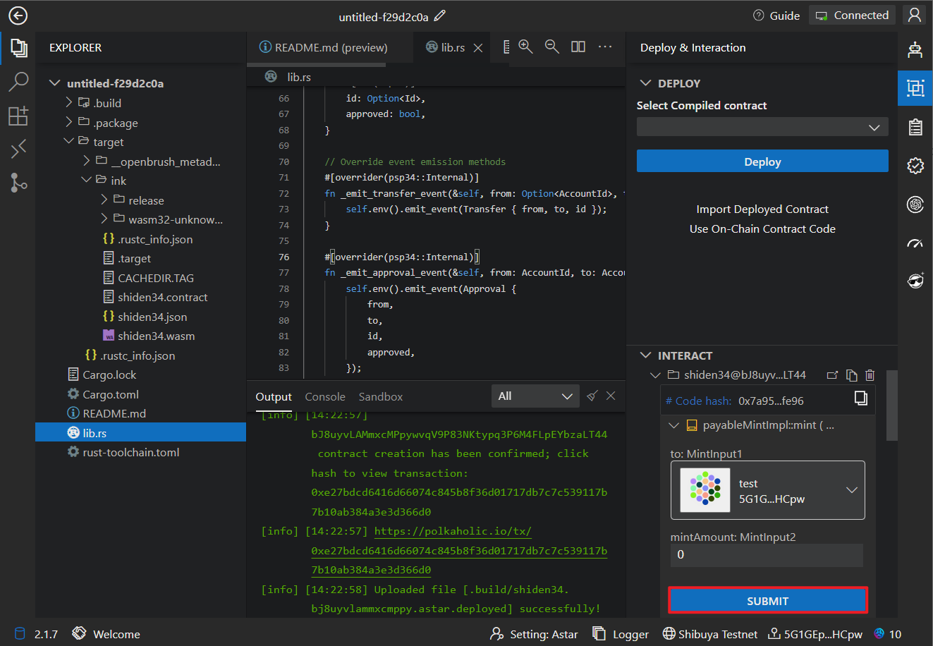 Before deploying the contract, you need to click on "Connect Wallet" in the upper right corner, choose your wallet, and use it to connect to the Astar blockchain.