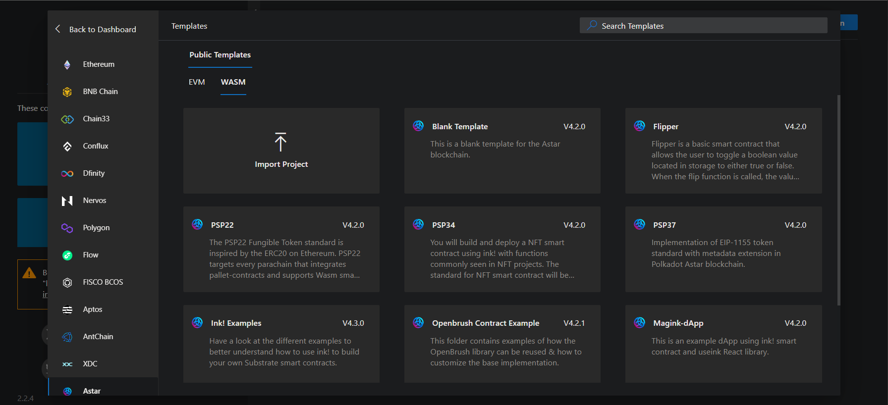 Astar WASM IDE offers developers a variety of basic or complex templates, such as Flipper, PSP22, PSP34, Magink-dApp, and more. Click to access a template.