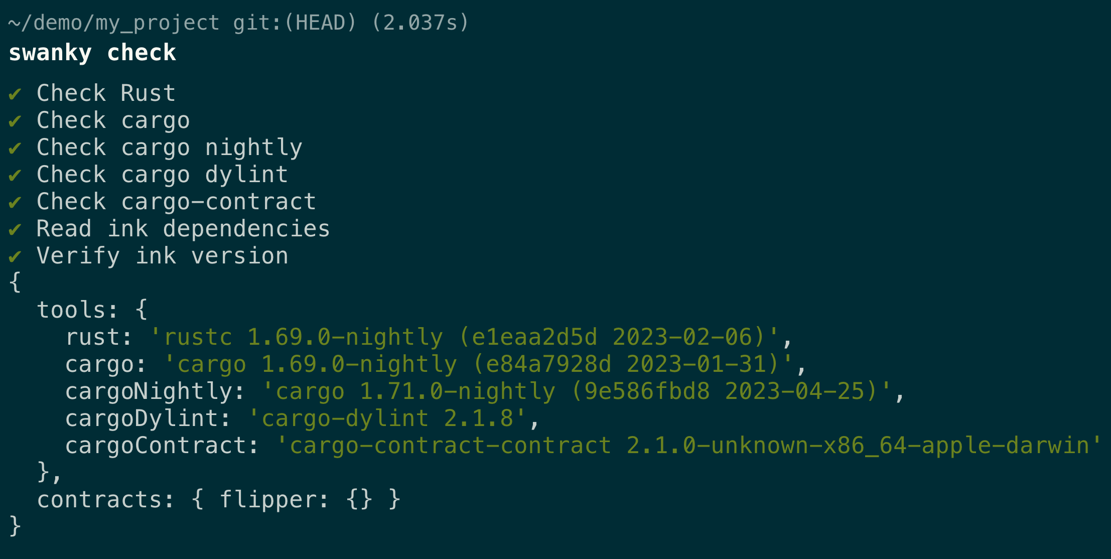 If you want to start from a more complete example like those in the swanky-dapps repo, or rmrk-ink, or you want to convert your existing contract to a swanky project, you can use swanky init --convert command.