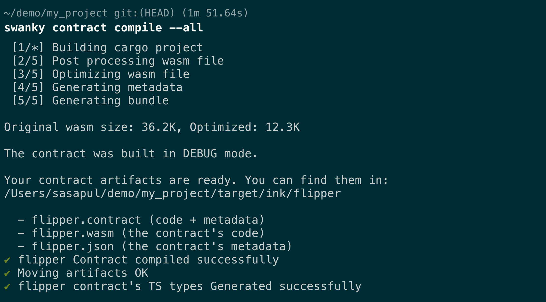 Your contracts are listed in swanky.config.json, and can be referred to by name field. Calling swanky contract compile CONTRACT_NAME will run cargo-contract compiler, generate TS types using Typechain, and move the artifacts and types to appropriate locations for later usage.