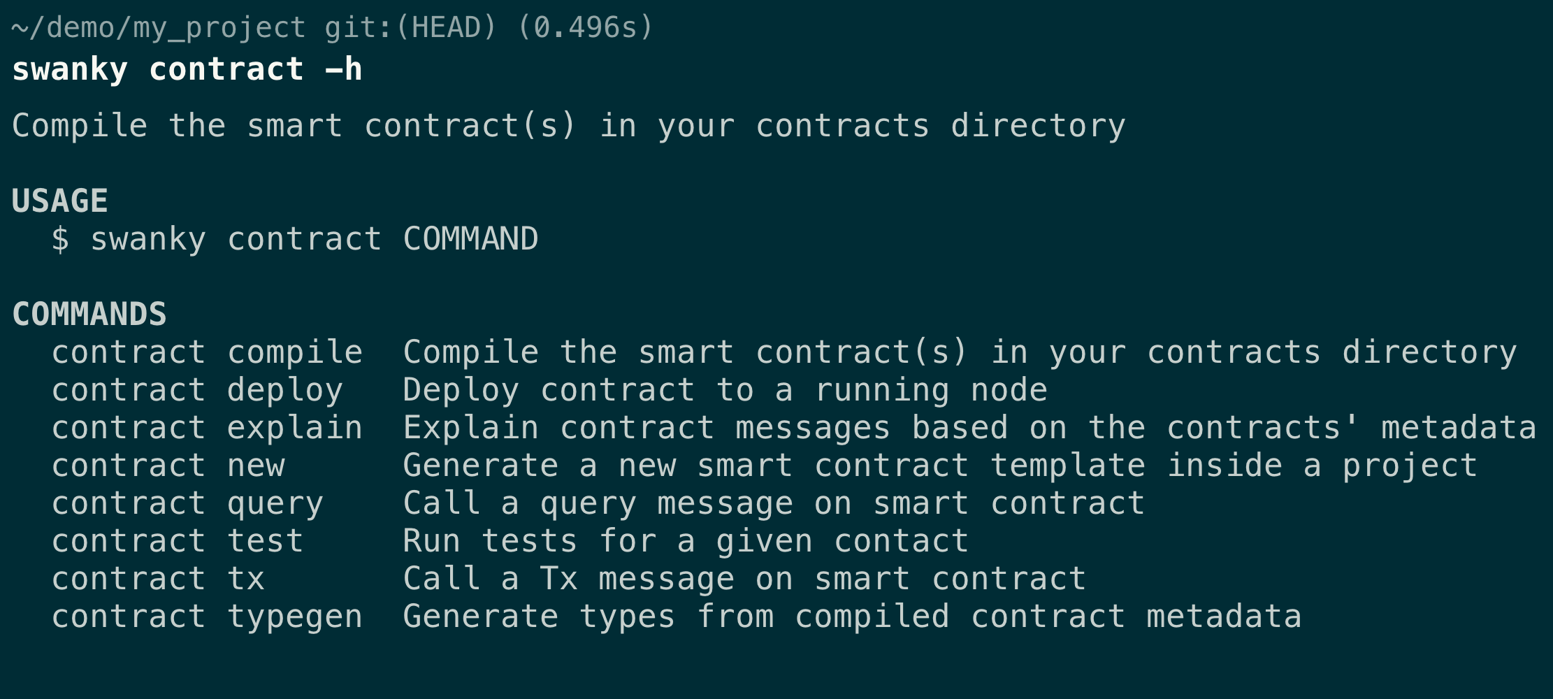 swanky contract SUB_COMMAND --help