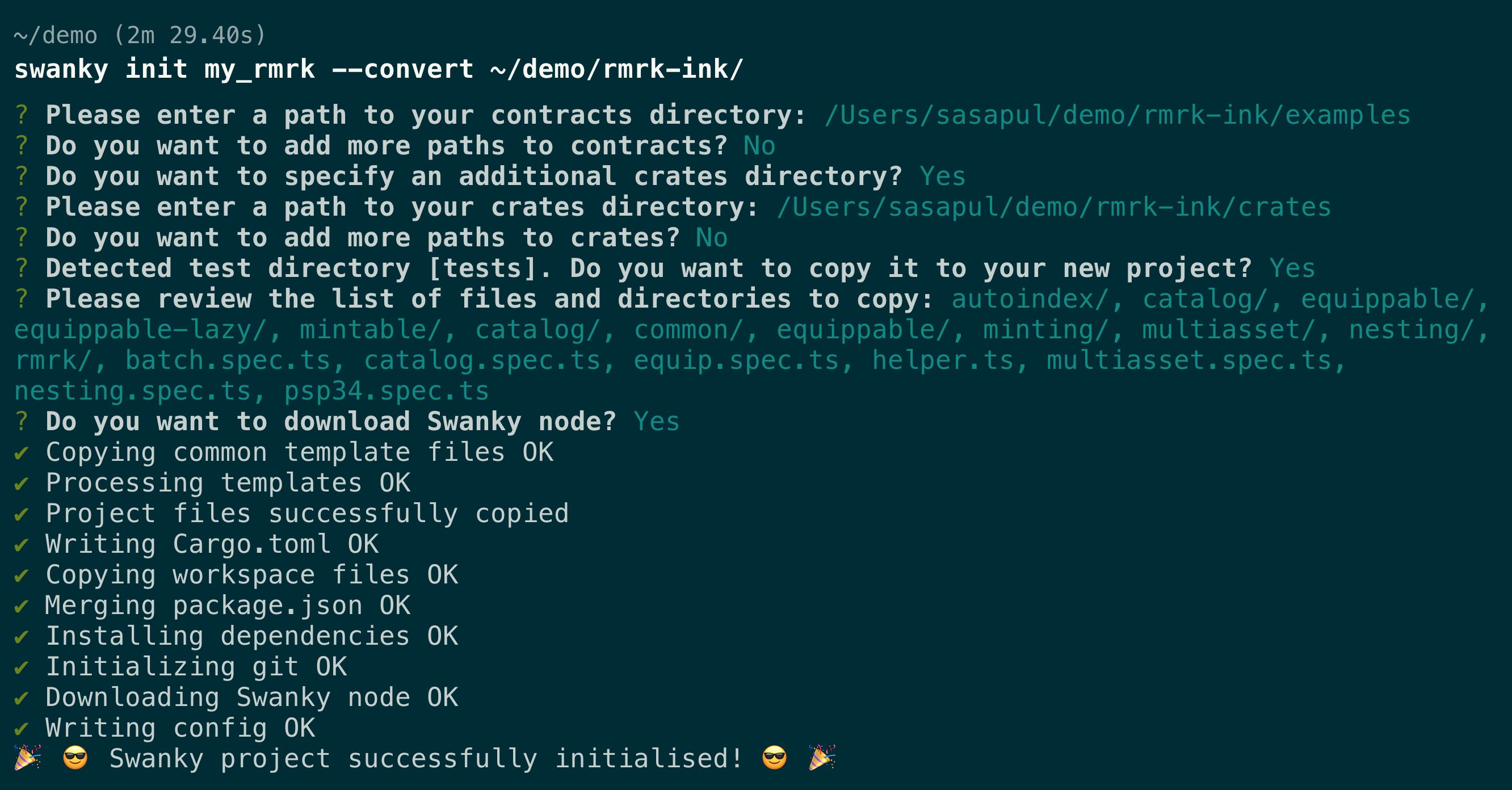 After gathering all the required information, the app will proceed to check your environment, scaffold the project, download and install (optionally) swanky node and the project dependencies.
