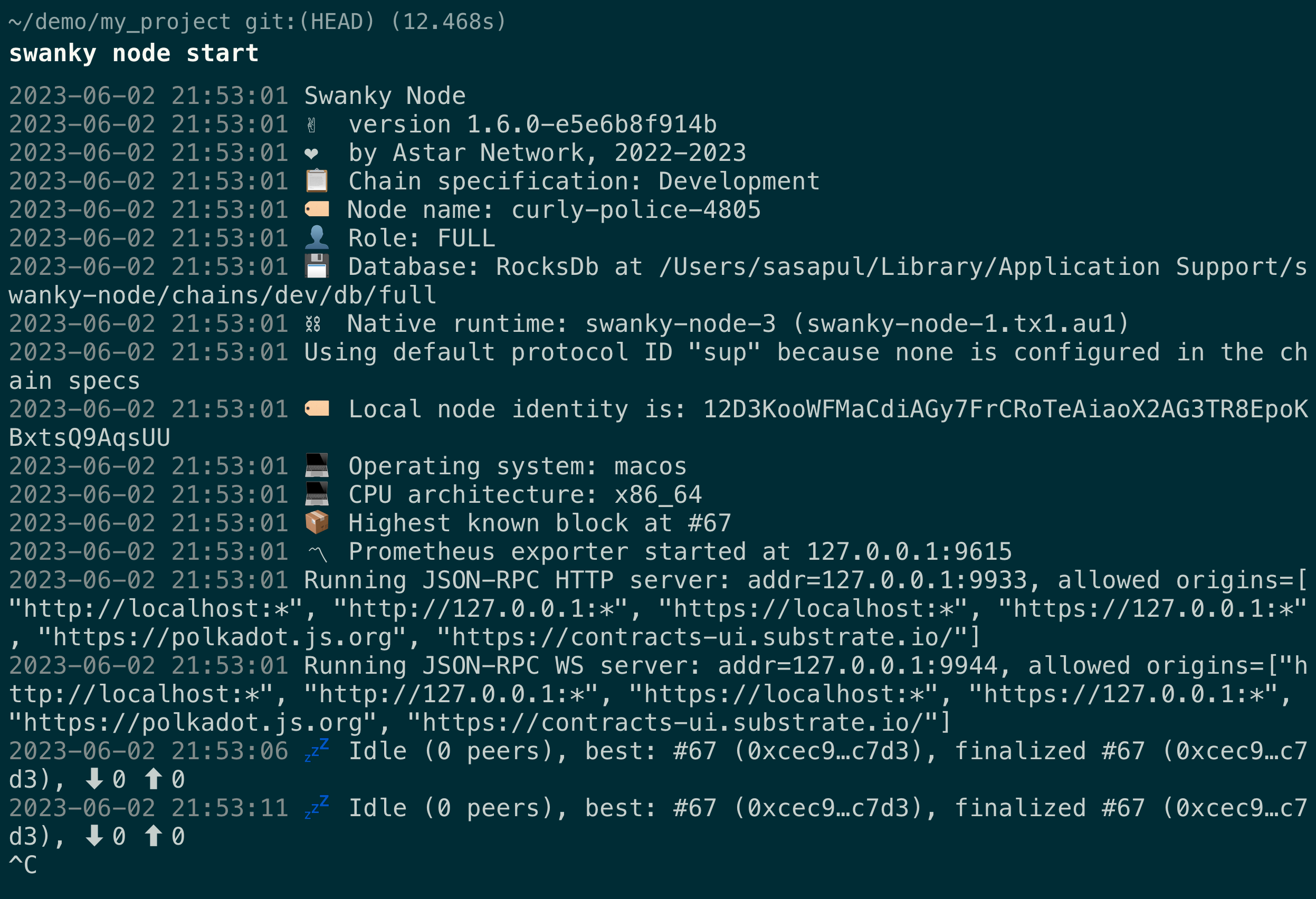 Simply running swanky node start will start the node, and the node will preserve the state across restarts.