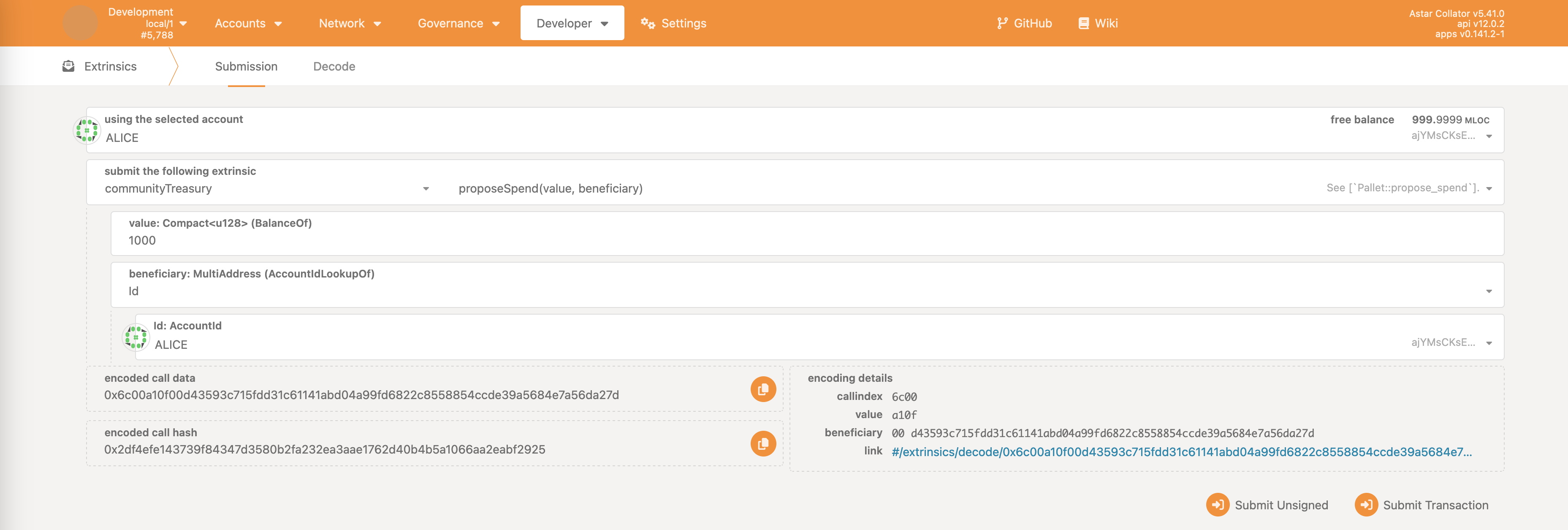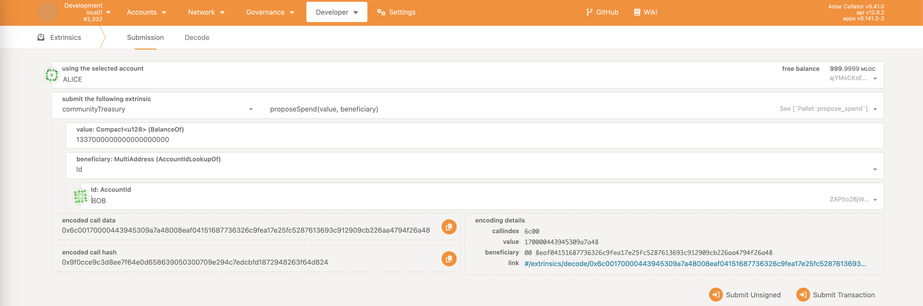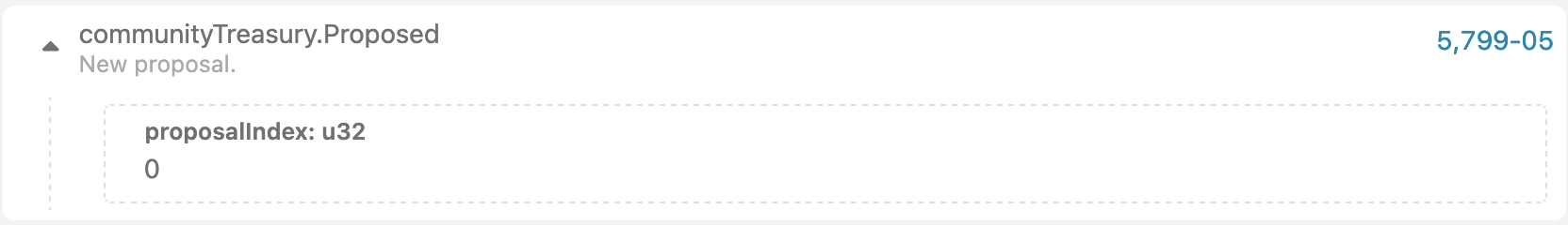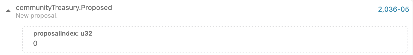 Example of the community treasury spending proposal. Note that this is done on the communityTreasury pallet.