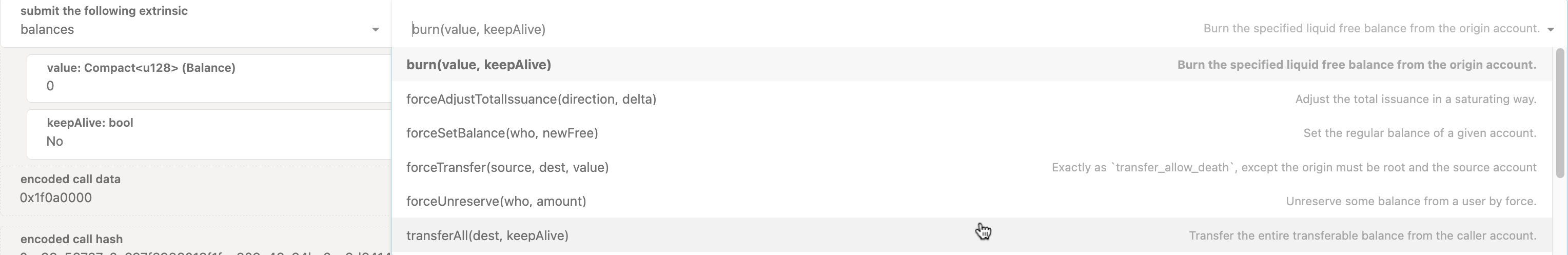 we can observe that pallet Balances has calls like burn, forceTransfer or transferAll. Transforming these into snake_case we get burn (unchanged), force_transfer and transfer_all.