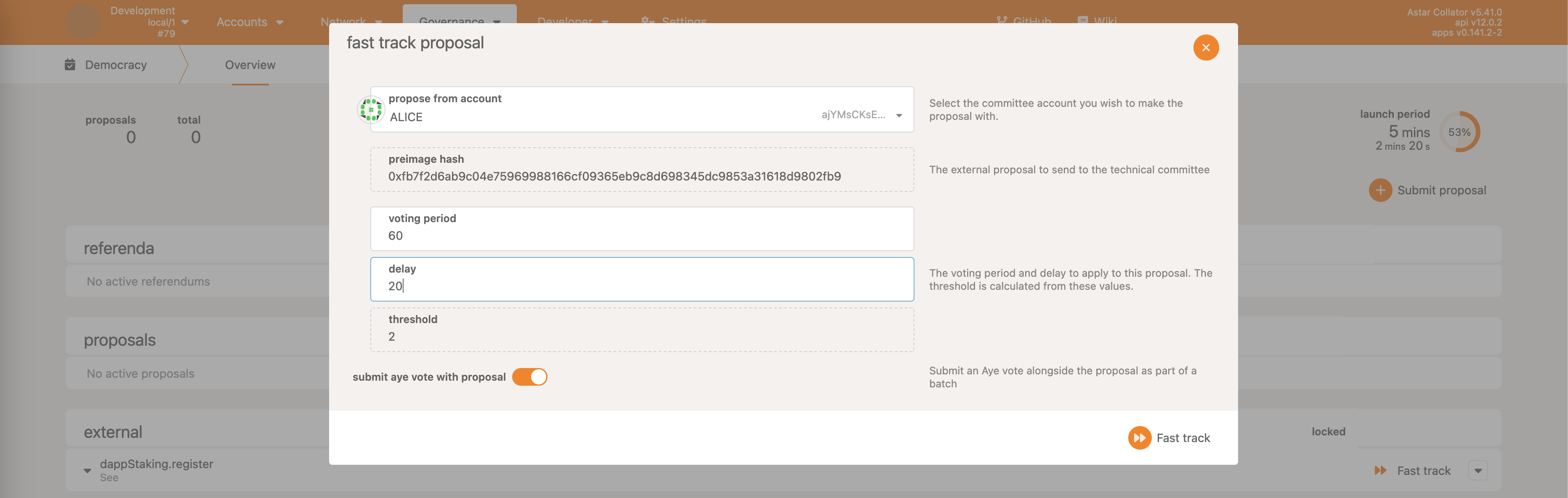 This is very similar to the previous example with the regular fast track with a small difference - the minimum voting period duration check is ignored. This means that the voting period length can be arbitrary.
