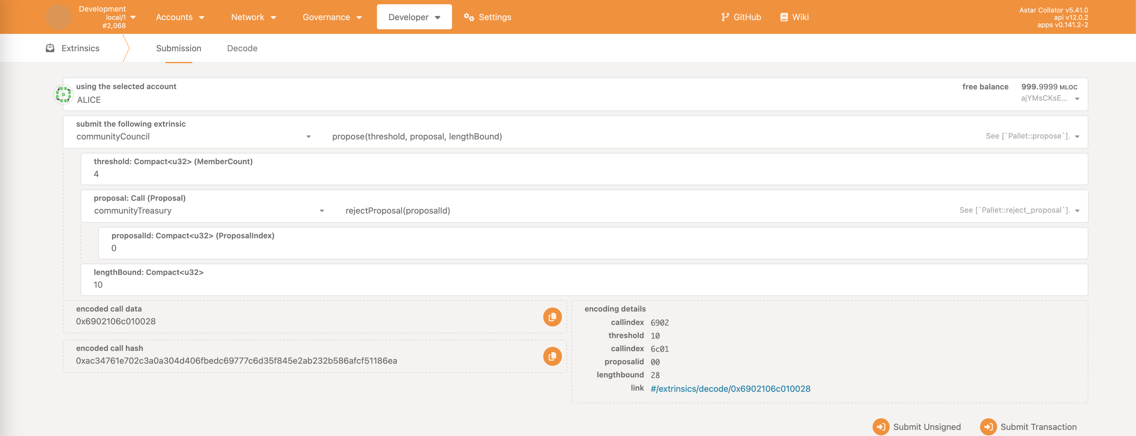 Then the communityCouncil pallet must be selected, and the propose extrinsic call.