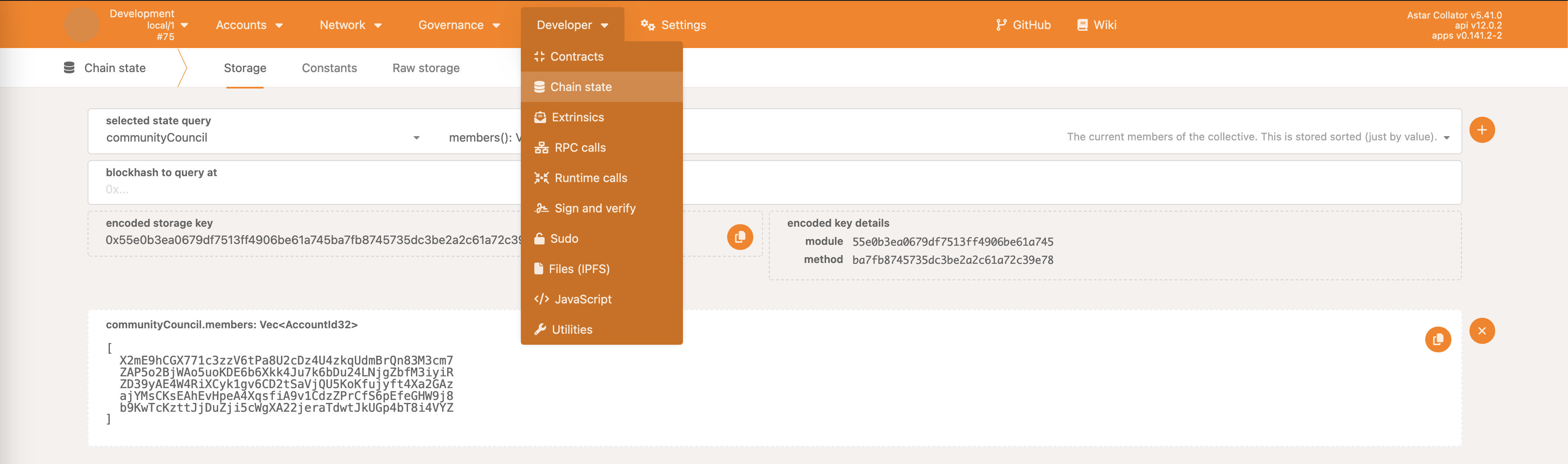 Even though there’s no neat interface to check who the council members are, it’s easy to do so as shown in the following image. Selecting Developer -> Chain state, pallet communityCouncil and members storage will list all the accounts that are part of the council.