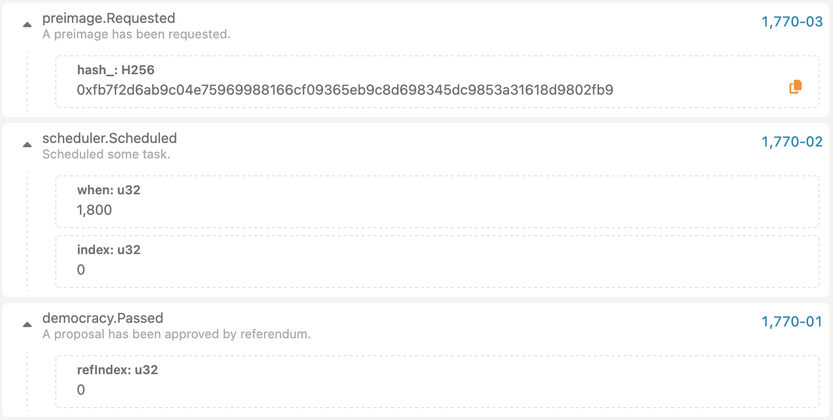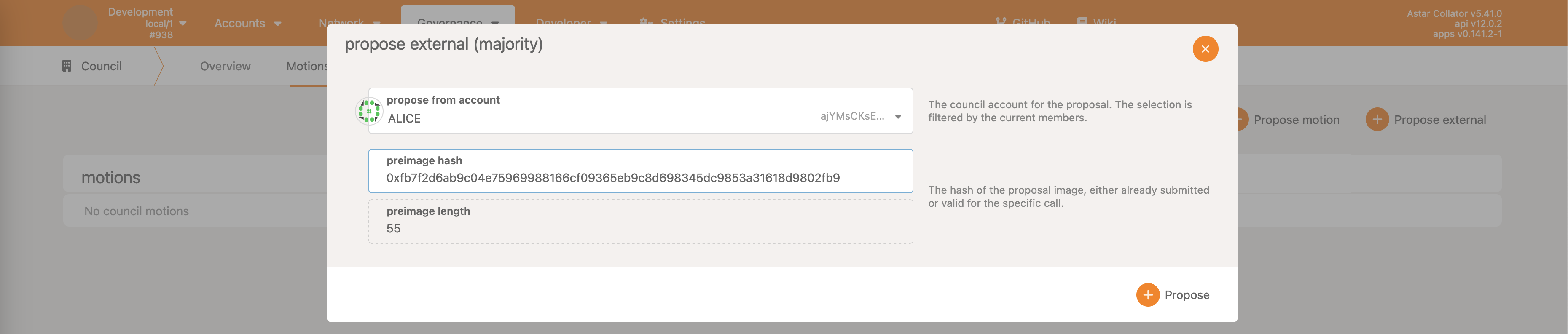 Once the proposal call is executed, user can observe the proposalHash and index. This can be used to vote & close the proposal as described in the first chapter.