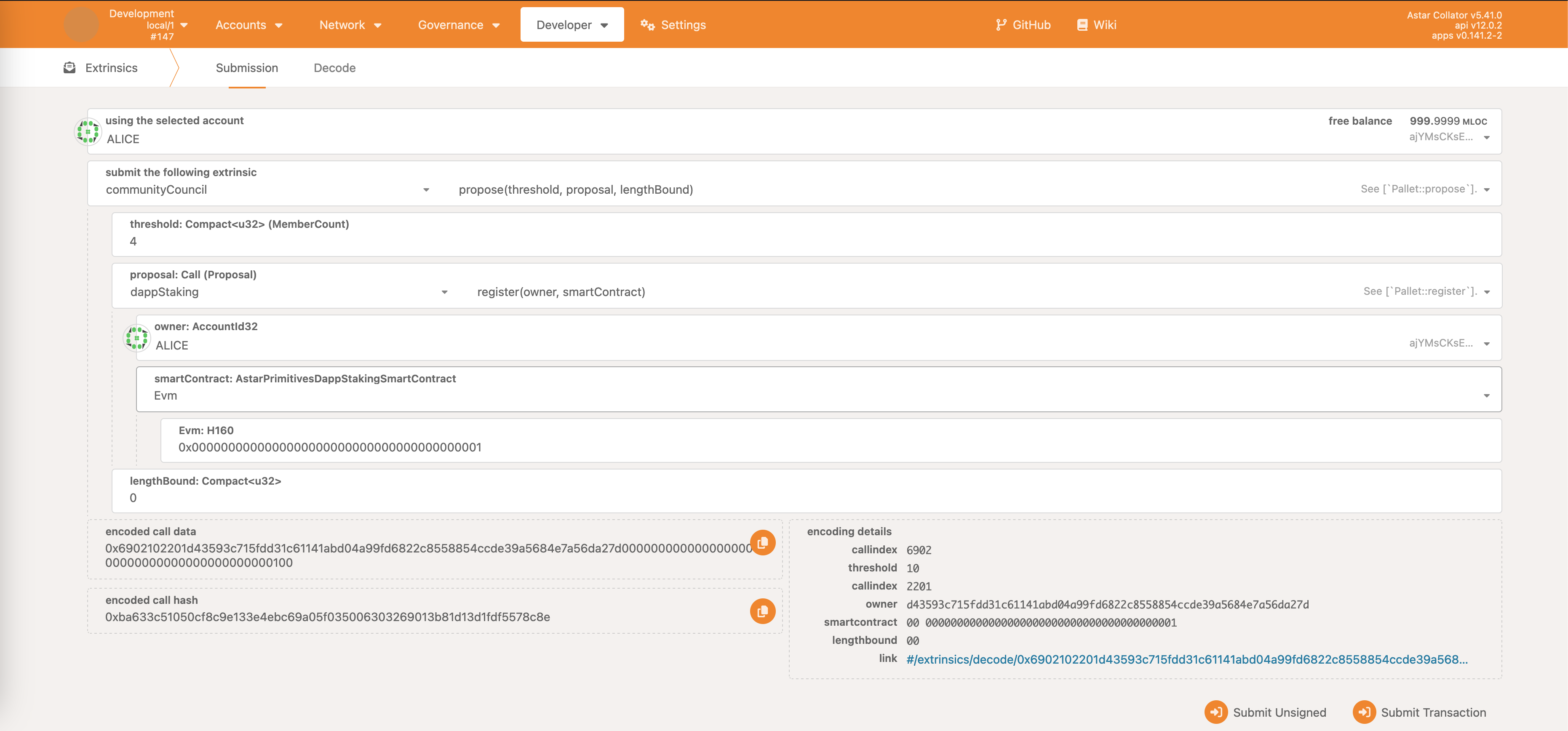 Once the transaction is submitted & executed, the dApp staking register call will be successfully executed.