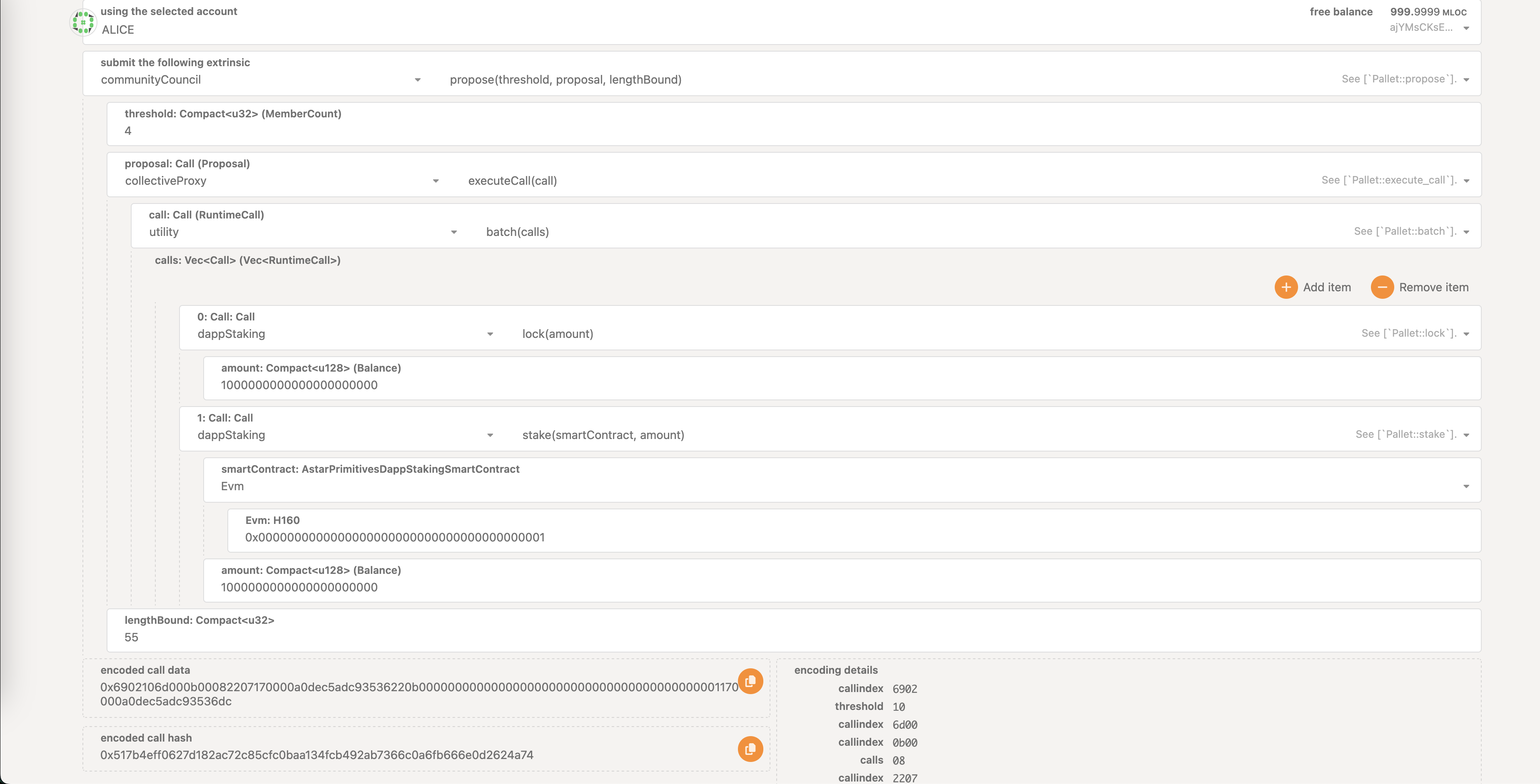 Utilizing dApp staking on behalf of the community treasury follows the same approach as already described, but requires an additional wrapping of dApp staking calls.