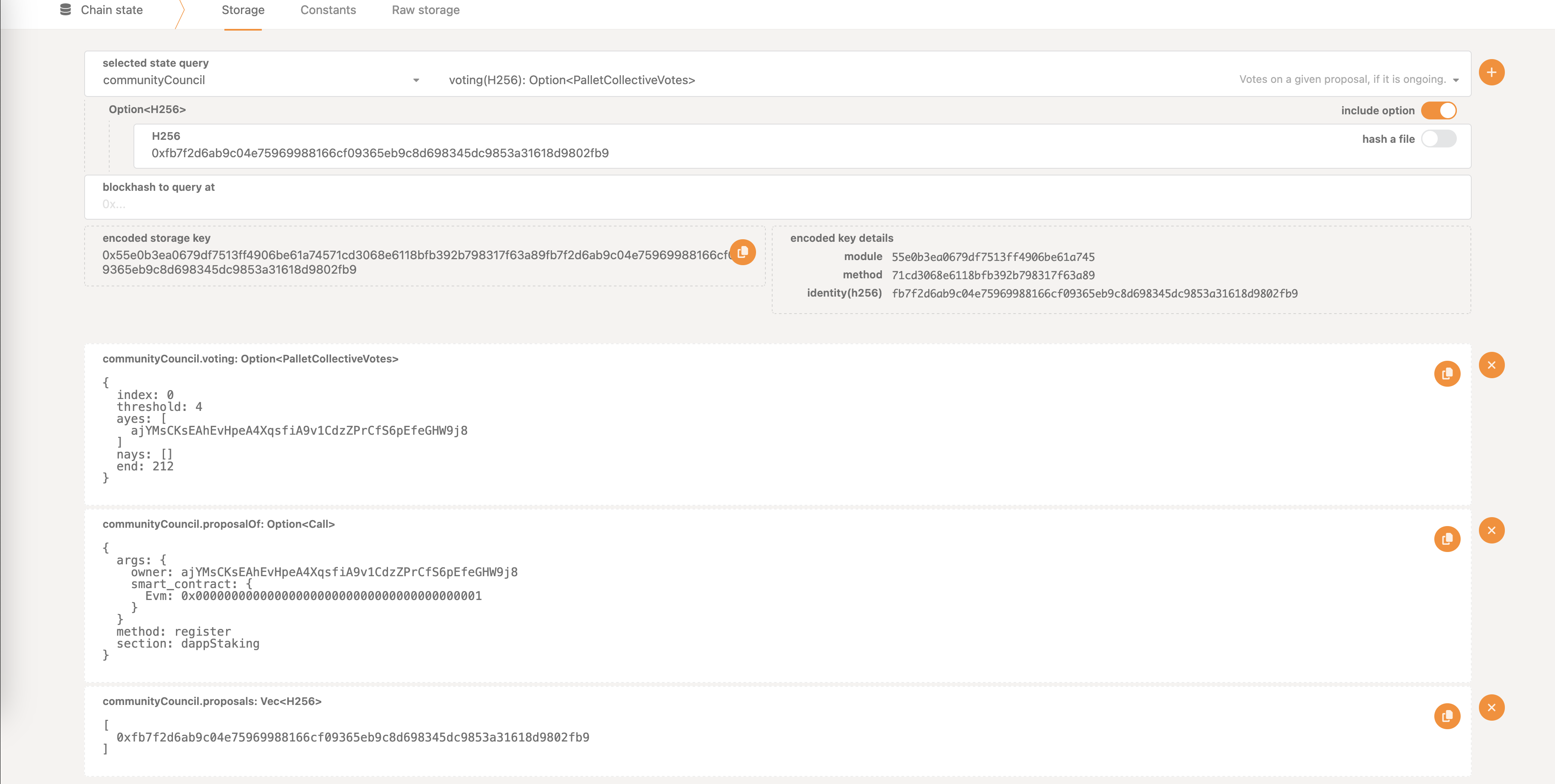 The voting storage map will display the current status of the voting - number of aye and nay votes, threshold & index.