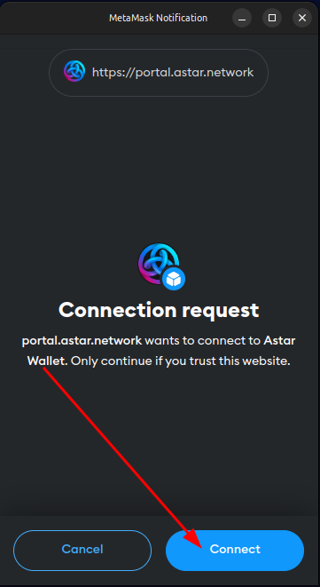 Review the connection request and, if you accept it, click the MetaMask "Connection request" button labeled "Connect" to accept the Astar Wallet snap connection request.