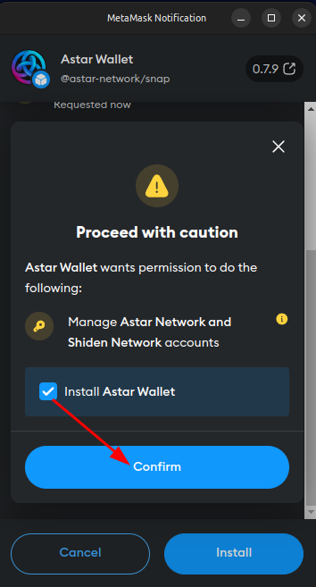 Click the arrow to view the entire list of permissions required by the Astar Wallet snap and, if you accept them, click the MetaMask "Install snap" button labeled "Install" to begin installing the Astar Wallet snap.