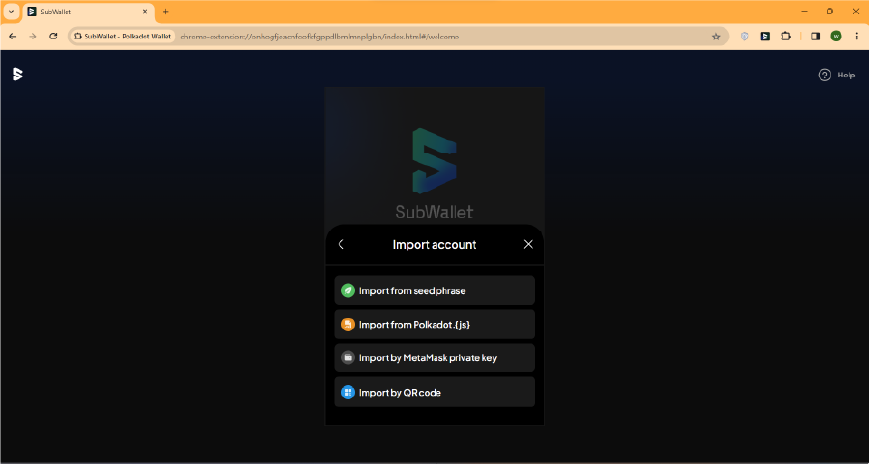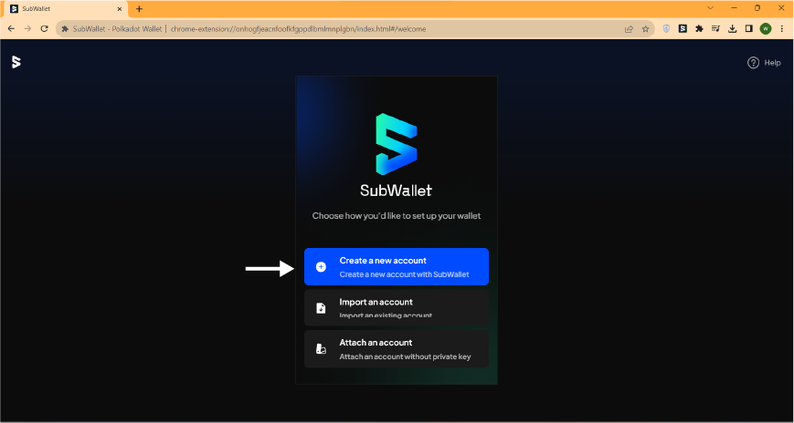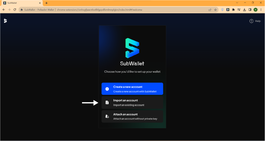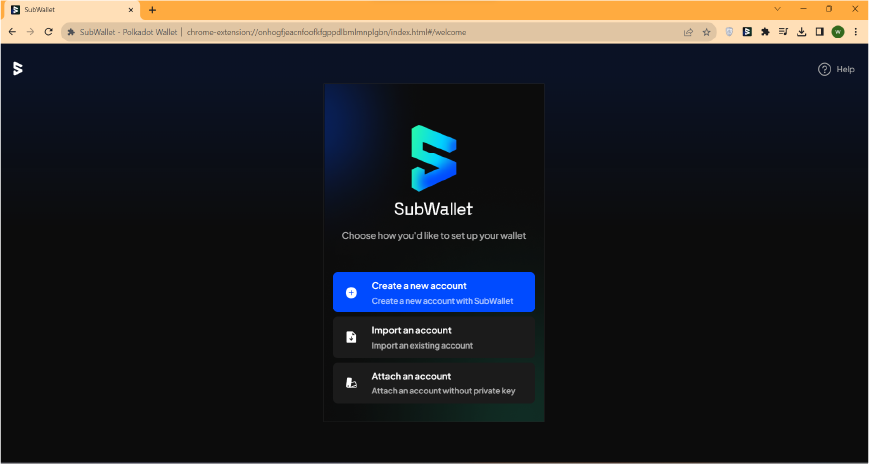 Once you have installed the extension, you'll have the option to create, import or attach an account (Ledger, Keystone, Polkadot Vault and Watch-only account)