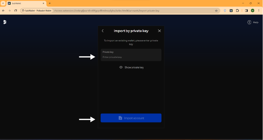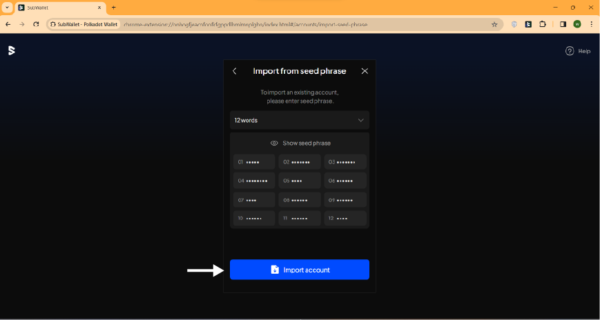 Enter your seed phrase in the text boxes. You can use either a 12-word seed phrase or a 24-word seed phrase to import your account. Click on Import account and your account has been imported!