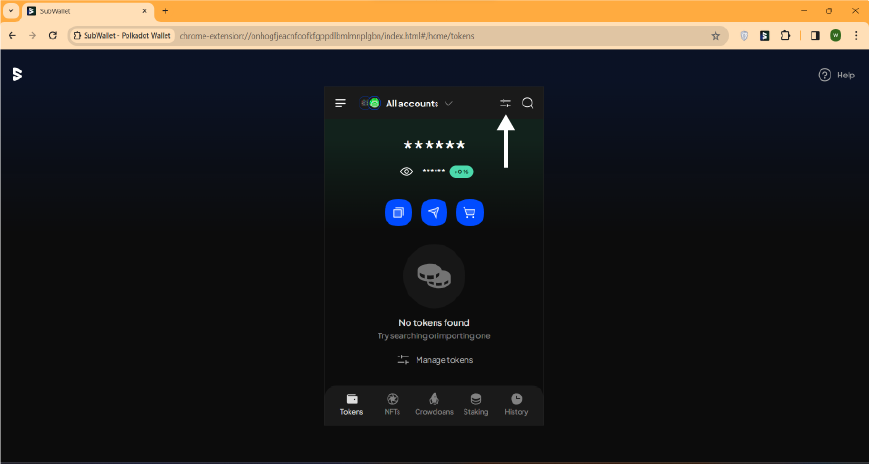 To Manage ASTR on SubWallet, choose the Customize asset display icon next to the search icon.