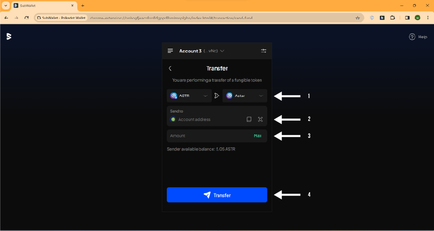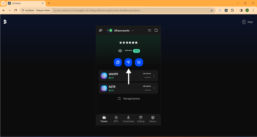 To get started with a simple token transfer to another address on Astar, you can click the send icon.