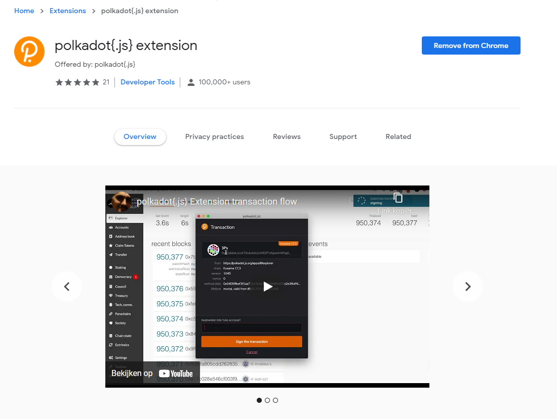 The browser plugin is available for both Google Chrome (and Chromium-based browsers like Brave) and Firefox. After installing the plugin, you should see the orange and white Polkadot{.js} logo in your browser menu bar.