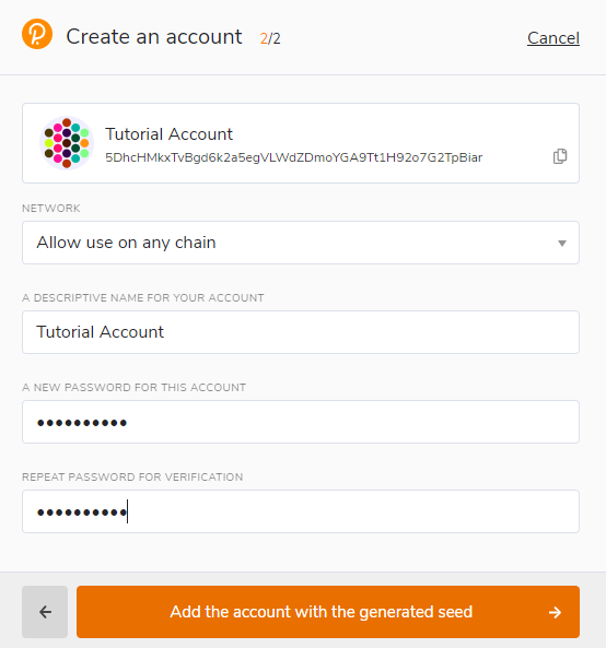 After clicking on Add the account with the generated seed, your account is created. We recommend also saving your account as json file somewhere safe.