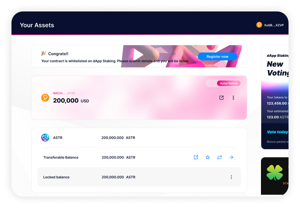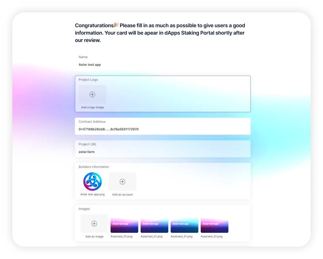 Congratulations! 🎉 Your project is now listed in dApp Staking and you can start your campaign and communication to attract stakers.