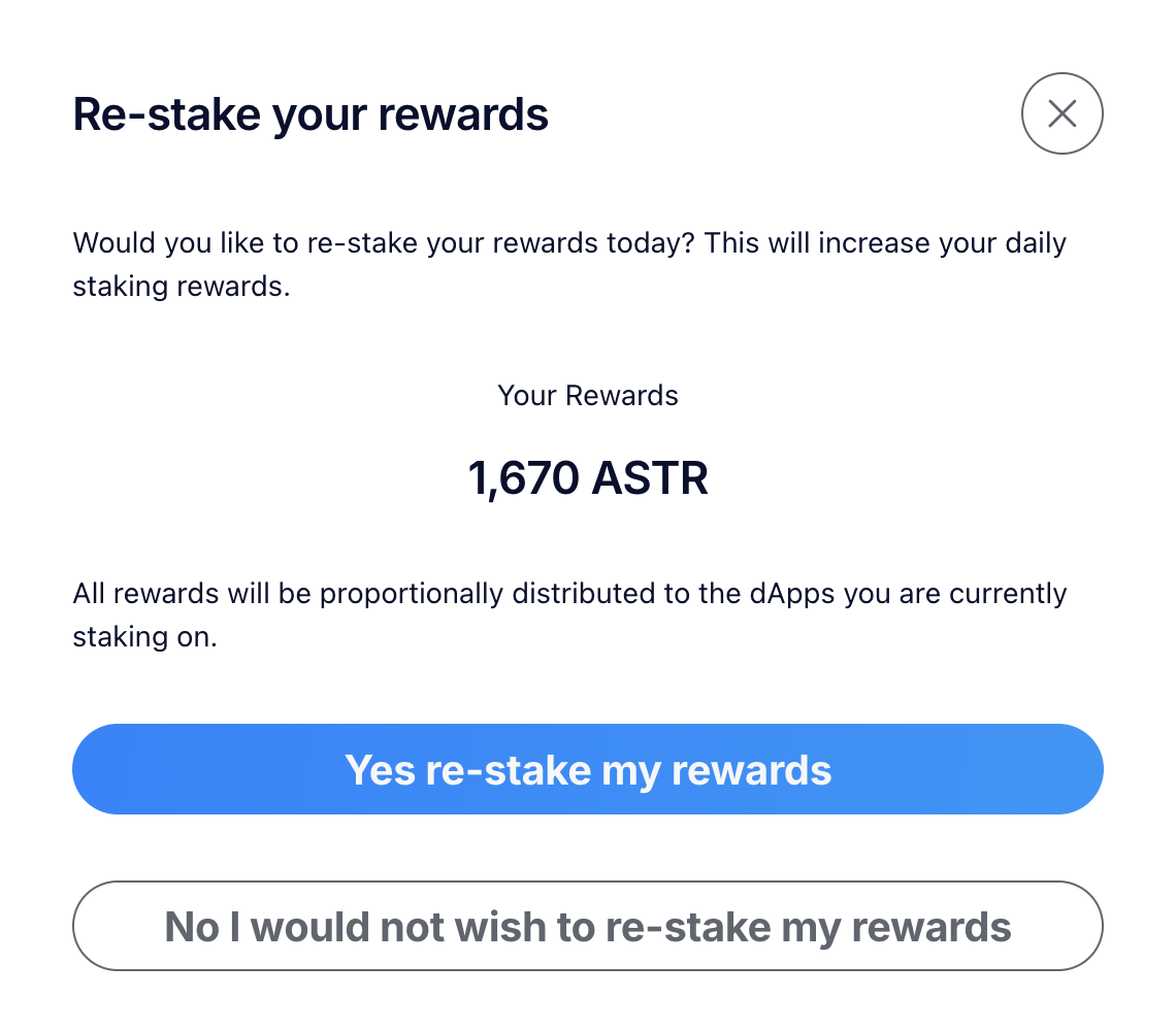 If you want to re-stake your rewards, just click Yes re-stake my rewards, sign the transactions and your rewards will re-stake proportionally to all dApps you currently staking on.