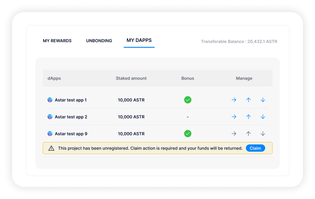 1. Click on the Unlock button (↑) on the dApp you want to unstake from;